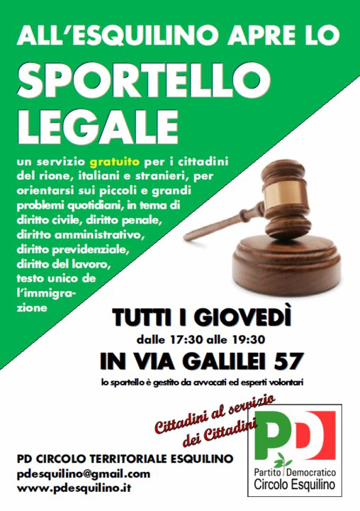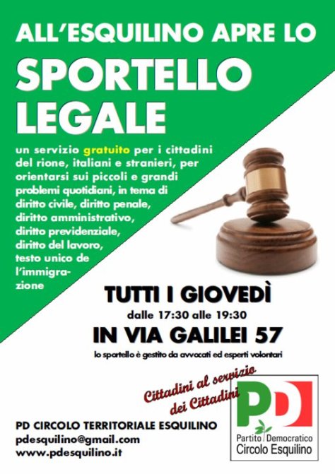 A pochi passi da Piazza Vittorio, la piazza più multietnica d’Italia, distante soli 5 minuti dalla stazione Termini troviamo, in Via Galilei 57, un luogo di sintesi tra integrazione e democrazia; due parole che, in questo Rione tanto bello quanto complicato, non devono rimanere distanti. Un Rione in cui ogni giorno si incontrano e ci si “scontra” con le tante diversità che lo popolano e che, contemporaneamente, lo rendono un posto affascinante. Proprio lo spirito che anima questo pezzo di città ha portato il circolo del Partito Democratico Esquilino a promuovere un’iniziativa rivolta a tutte le persone, italiane e immigrate, che troppo spesso hanno la necessità di essere assistite senza sapere a chi rivolgersi. Nasce così grazie alla collaborazione di uno staff di avvocati dello studio Michele Bonetti&Partners giovani ed esperti, sensibili e con la voglia di mettersi in gioco, lo Sportello Legale del cittadino che offre ogni Giovedì dalle ore 17 e 30 alle 20 in via Galilei 57 assistenza e consulenza legale GRATUITA per chiunque ne faccia richiesta.