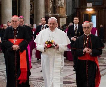 This handout picture released on March 14, 2013 by the Vatican press office shows Pope Francis (C) arrives for a prayer at Rome’s Santa Maria Maggiore basilica early on his first full day as the head of the world’s 1.2 billion Catholics. ANSA/OSSERVATORE ROMANO ++ NO SALES, EDITORIAL USE ONLY +++