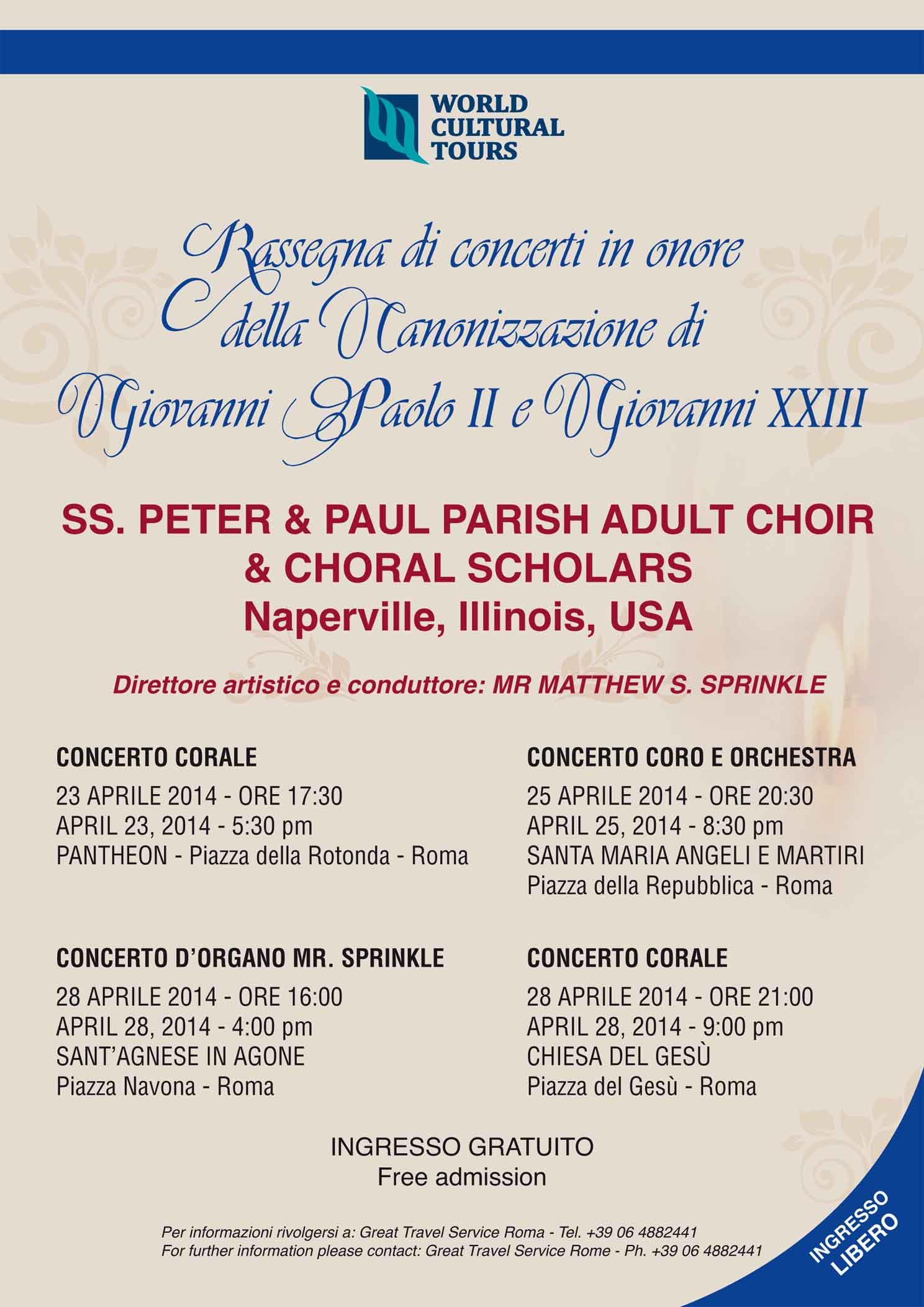 abbiamo il piacere di informarVi che il Coro St. Peter & Paul Parish Adult Choir & Choral Scholars di Naperville, Illinois ha organizzato una Rassegna di Concerti per celebrare l’evento della Canonizzazione di Papa Giovanni Paolo II e di Papa