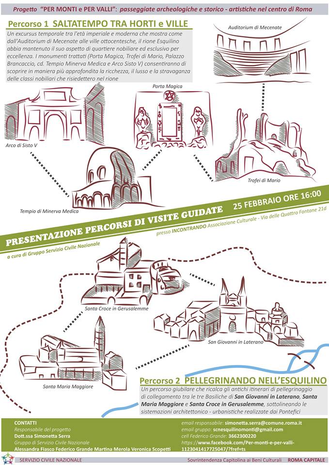 siamo un gruppo di giovani selezionati dalla Sovrintendenza Capitolina dei Beni culturali di Roma Capitale per il progetto di servizio civile nazionale “Per Monti e per valli – passeggiate archeologiche nel centro di Roma”.Vi aspettiamo numerosi presso la sede dell’Associazione Incontrando, qui vi presenteremo i nostri percorsi principali.Ci piacerebbe sensibilizzare l’intera cittadinanza alla conoscenza storica e monumentale dei Rioni Monti ed Esquilino.Le passeggiate archeologiche, sono totalmente gratuite.