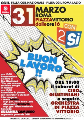 Al termine della manifestazione organizzata dalla CGIL venerdì 31 marzo nei giardini Nicola Calipari di Piazza Vittorio dalle ore 19,00 si esibiranno Ciro Giustiniani, l’attore che lavora a Made in Sud e fa la parodia del boss dei matrimoni.e a seguire l’Orchestra di Piazza Vittorio. L’evento è ad ingresso gratuito…vi aspettiamo numerosi.