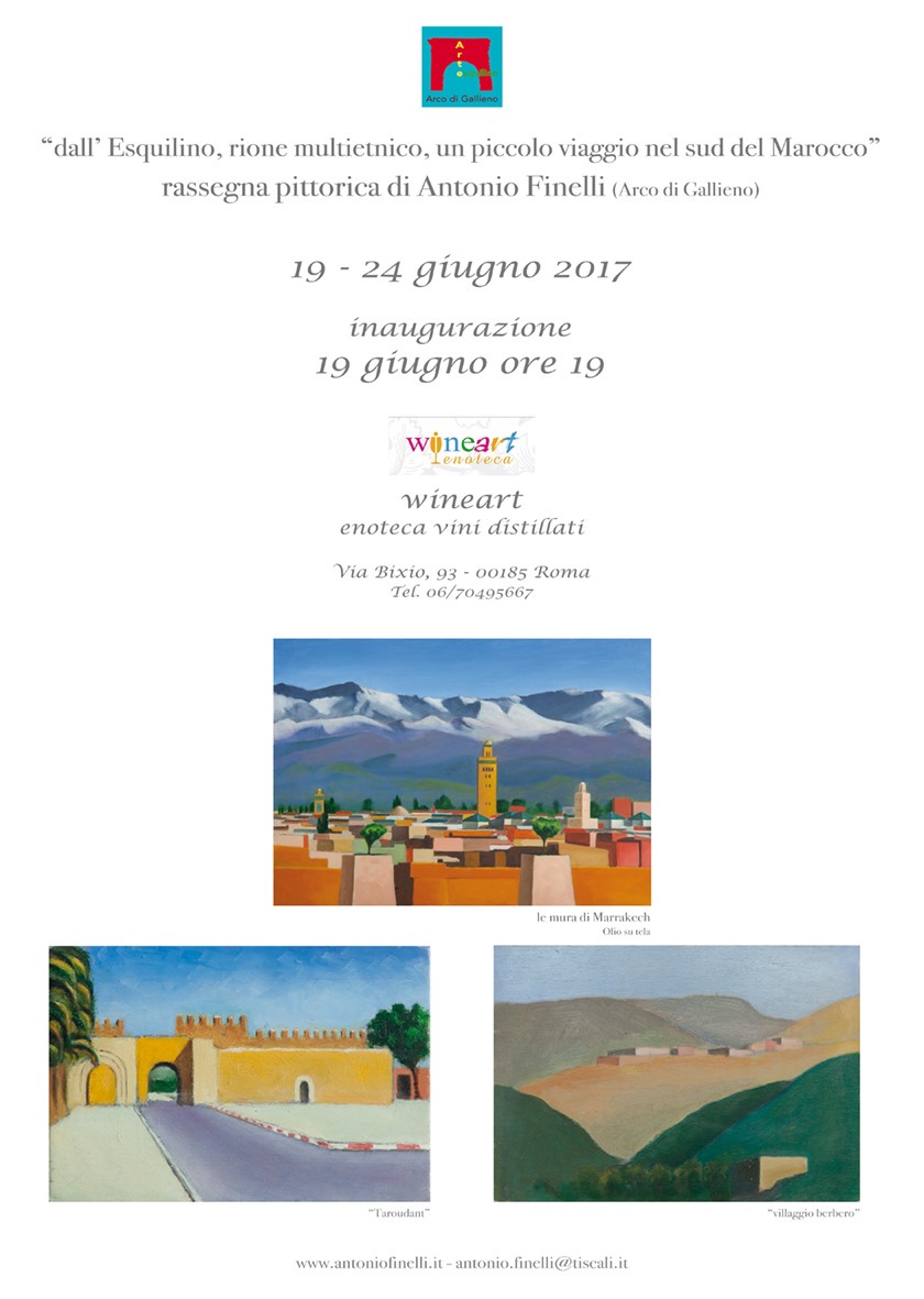 vi invito ad una mia piccola mostra. Si tratta di una rassegna di alcuni miei lavori dedicati al Sud del Marocco che viene ospitata in una piccola ma accogliente enoteca sita in via Bixio, 93 -Roma. L’inaugurazione avverrà lunendi’ 19 giugno alle ore 19. Un caro saluto