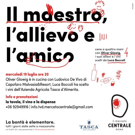 Da Mercato Centrale Roma mercoledì 19 luglio alle ore 20 torna il secondo appuntamento con “Il maestro, l’allievo e l’amico”. Nella cucina del ristorante “La Tavola, il Vino e la Dispensa” insieme a Oliver Glowig ci sarà Ludovico De Vito del Capofaro Malvasia & Resort. I vini proposti saranno dell’Azienda Agricola Tasca d’Almerita, selezionati e presentati da Luca Boccoli. Un cena di 4 portate preparate dallo Chef insieme ai suoi ex allievi… riusciranno a superare il Maestro? Ti aspettiamo in Ala Giolitti.