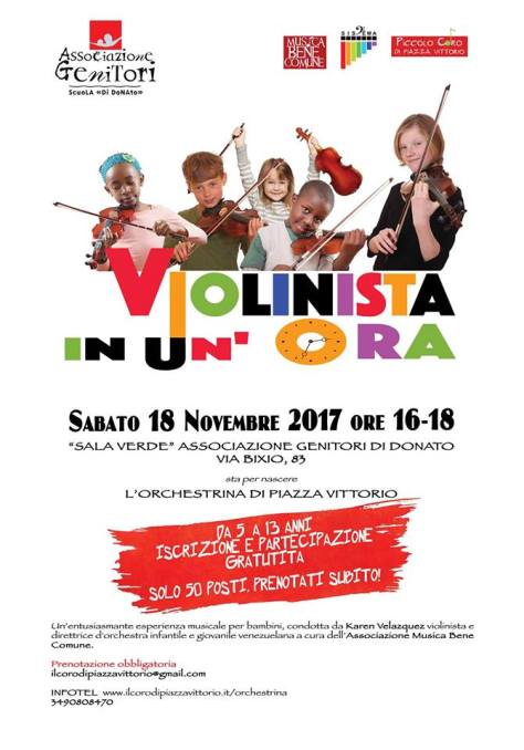 “Violinista in un’ora” è un laboratorio ideato dal M° Andrea Gargiulo di MusicainGioco, a cura di Musica Bene Comune per l’Associazione Genitori di Donato, diretto da Karen Velazquez.