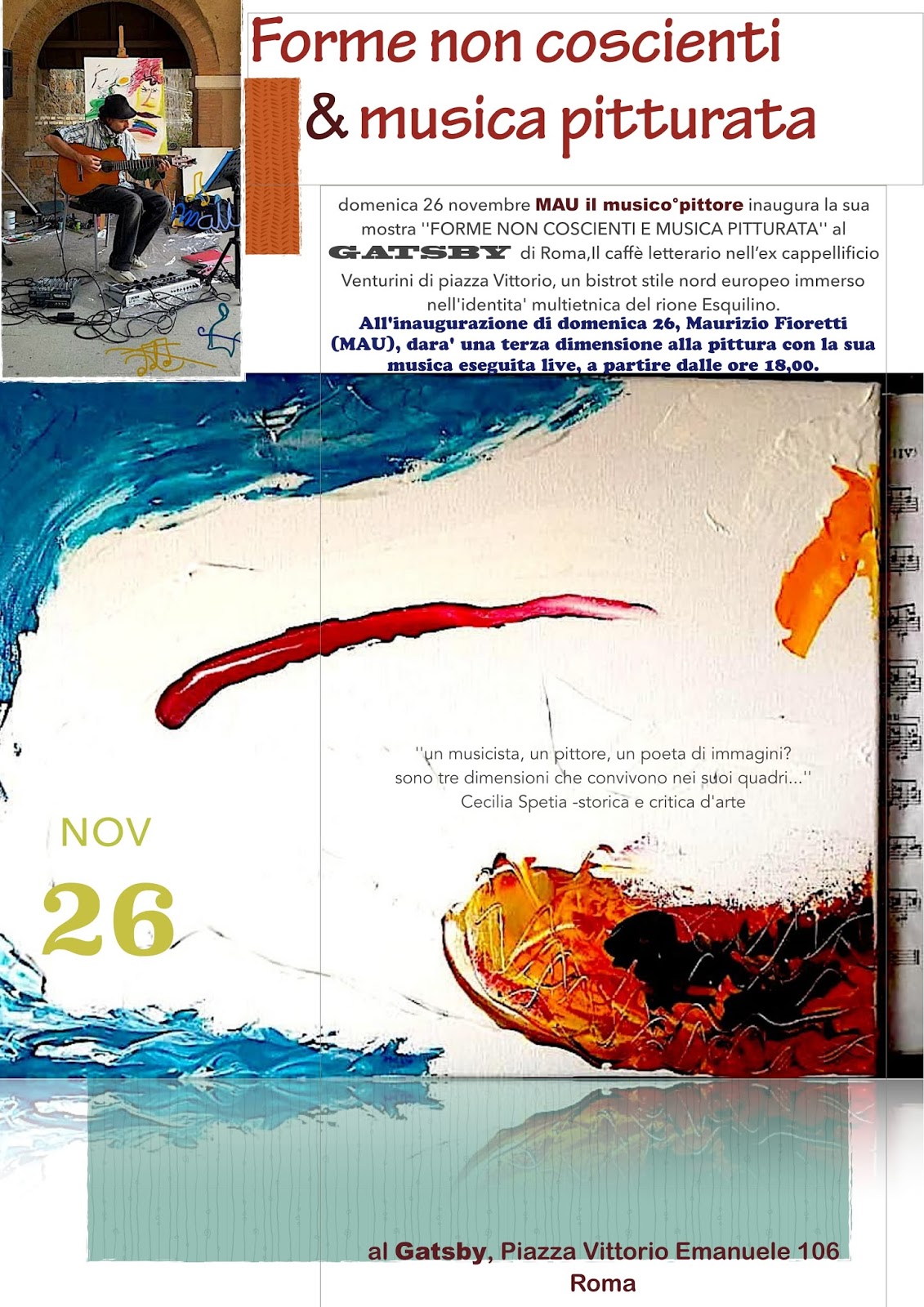 Domenica 26 novembre MAU il musico°pittore inaugura la sua mostra ”FORME NON COSCIENTI E MUSICA PITTURATA” al GATSBY di Roma,Il caffè letterario nell’ex cappellificio Venturini di piazza Vittorio, un bistrot stile nord europeo immerso nell’identita’ multietnica del rione Esquilino.