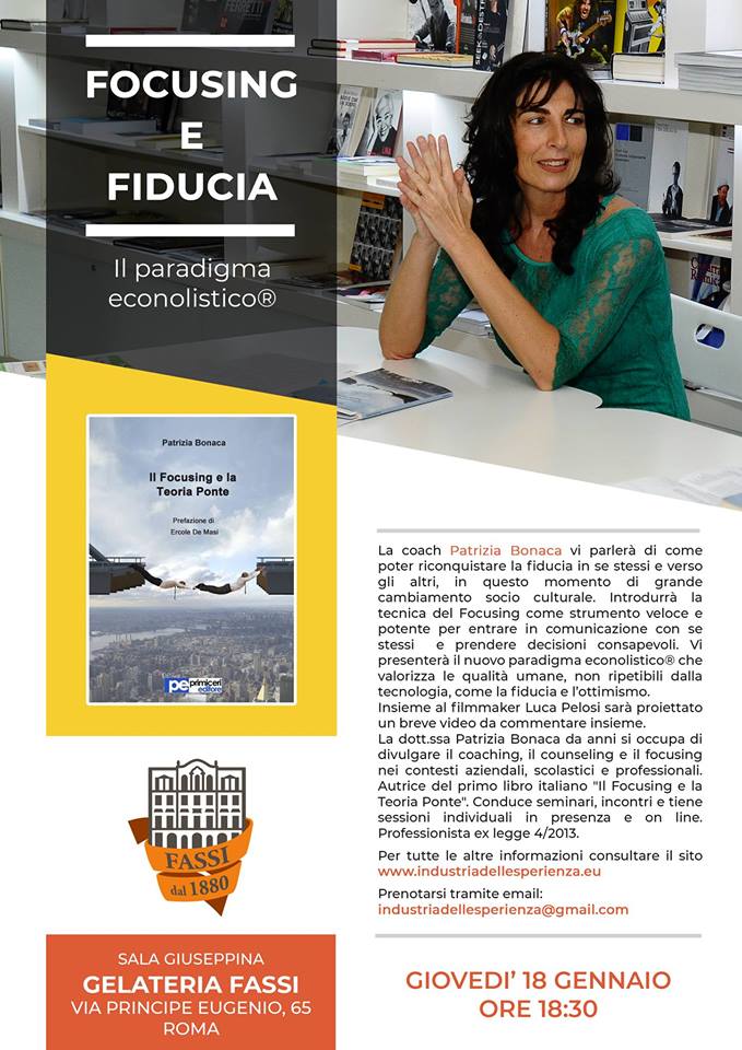 Giovedì 18 gennaio, alle ore 18:30, la coach Patrizia Bonaca, autrice del libro “Il Focusing e la Teoria Ponte”, parlerà di come riconquistare la fiducia in se stessi e verso gli altri, in questo momento di grande cambiamento socio culturale. Introdurrà la tecnica del Focusing come strumento veloce per prendere decisioni consapevoli e presenterà il nuovo paradigma econolistico® che valorizza le qualità umane, non ripetibili dalla tecnologia, come la fiducia e l’ottimismo. Econolismo® è infatti un neologismo che indica la necessità di riconsiderare l’essere umano con il suo immenso potenziale al centro del sistema sociale ed economico. Rappresenta la sintesi tra l’aspetto concreto e la forza invisibile delle nostre scelte. Sarà anche proiettato e commentato un video realizzato dal filmmaker Luca Pelosi. Per ulteriori informazioni è possibile consultare il sito www.industriadellesperienza.eu. Incontro gratuito, prenotazione consigliata all’indirizzo industriadellesperienza@gmail.com.
