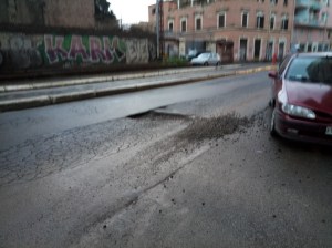 Giolitti (ed è stata tappata in giornata) domenica 14 gennaio, (come i lettori più attenti del nostro blog ricorderanno) abbiamo pubblicato le foto delle altre numerosissme buche presenti nella via (vedi). Ebbene, nella giornata di lunedì, sono state tappate quasi tutte come testimoniano le fotografie. Certo con questo intervento non si risolvono i problemi atavici di via Giolitti e, sicuramente, con le prossime piogge si apriranno altre buche, ma è un primo passo almeno per evitare temporaneamente e per quanto possibile sicure cadute e guasti meccanici.
