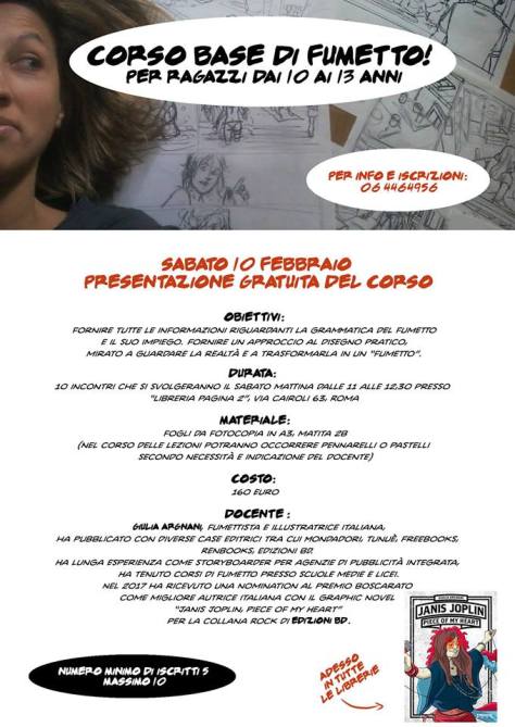 Sabato 10 febbraio presso la libreria Pagina 2 di Roma (rione Esquilino) alle ore 11,00 si terrà una lezione gratuita di presentazione e avvio del corso di fumetto dedicato ai ragazzi dai 10 ai 13 anni organizzato e tenuto dalla fumettista e illustratrice Giulia Argnani.