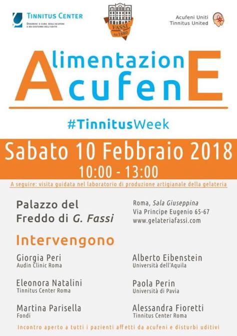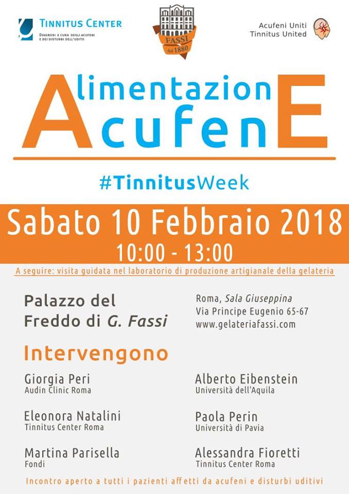 In collaborazione con l’associazione Acufene Uniti – Tinnitus United (Au-tu) e con il patrocinio del Tinnitus Center si terrà a Roma l’ Open Day rivolto a tutti i pazienti con acufeni sabato 10 febbraio 2018 dalle 10.00 alle 13.00 presso il Palazzo del Freddo di Giovanni Fassi. La manifestazione vedrà la partecipazione della Prof. Paola Perin dell’Università di Pavia, del Prof. Alberto Eibenstein dell’Università dell’Aquila, della dr.ssa Barbara Fioretti e dr.ssa Eleonora Natalini del Tinnitus Center – European Hospital, della dr.ssa Martina Parisella, biologo-nutrizionista di Fondi, della dr.ssa Giorgia Peri, audioprotesista presso l’Audin Clinic-Roma. La manifestazione rientra tra le numerose iniziative che si svolgeranno a livello internazionale nell’ambito della settimana sulla consapevolezza dell’acufene, la Tinnitus Week #TinnitusWeek2018, organizzata come ogni anno dalla British Tinnitus Association (BTA). Si parlerà di acufene e alimentazione e saranno presentati i risultati delle recenti pubblicazioni sull’acufene in ambito scientifico. I pazienti del pubblico in sala saranno invitati a partecipare attivamente alla discussione. A seguire: visita guidata nel laboratorio di produzione artigianale della gelateria Fassi. Vi aspettiamo numerosi!!!