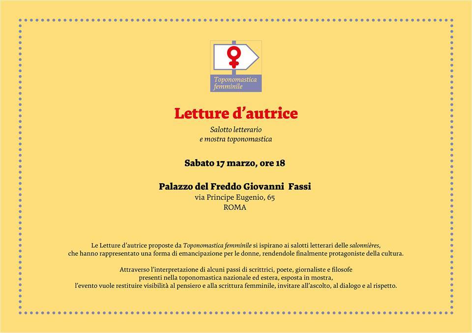 L’Associazione Toponomastica femminile organizza un altro Salotto letterario. Questa volta le Letture d’autrice avranno come tema la cucina. Saranno letti brani di varie autrici italiane e straniere da Simone de Beauvoir a Joice Lusso, da Grazia Deledda a Elsa Morante a Giana Anguissola a Ariana Fallaci, da Emily Dickinson alle sorelle Bronte, ecc