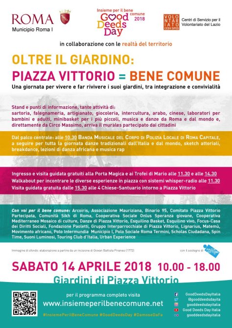 In occasione del fine settimana dedicato ai beni comuni, il Good Deeds Day 2018, a piazza Vittorio si svolgerà una giornata per rivivere i suoi giardini tra integrazione e convivialità.