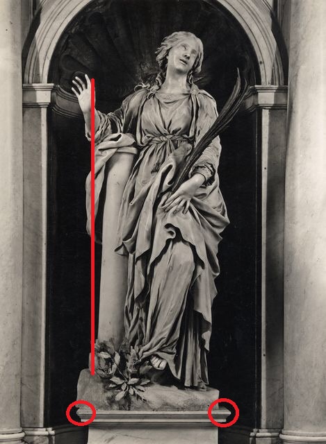 Guardando la statua di Santa Bibiana prima che venisse retaurata si può notare quello che spinse, dopo un attento esame del gruppo di restauratori guidato dalla prof.ssa M. Grazia Chilosi, a spostarla per analizzarla accuratamente ed operare un restauro che le ridonasse la posizione originale che risultava evidentemente alterata da quella che G.L.Bernini aveva pensato nel 1625. Mai e poi mai un genio perfezionista come lui avrebbe accettato che la colonna del martirio non fosse perpendicolare alla base e che la statua fosse visibilmente spostata sulla sinistra e non al centro del basamento come evidenziato nella figura 1