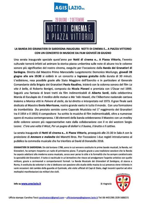 28 giugno inaugurazione con la Banda dei Granatieri di Sardegna con un concerto di musiche da film