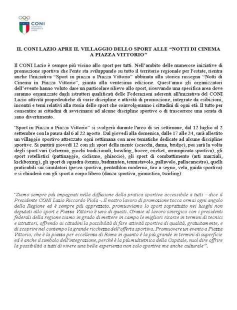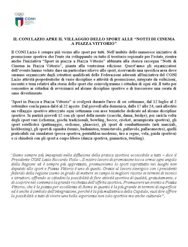 IL CONI LAZIO APRE IL VILLAGGIO DELLO SPORT ALLE “NOTTI DI CINEMA E … A PIAZZA VITTORIO