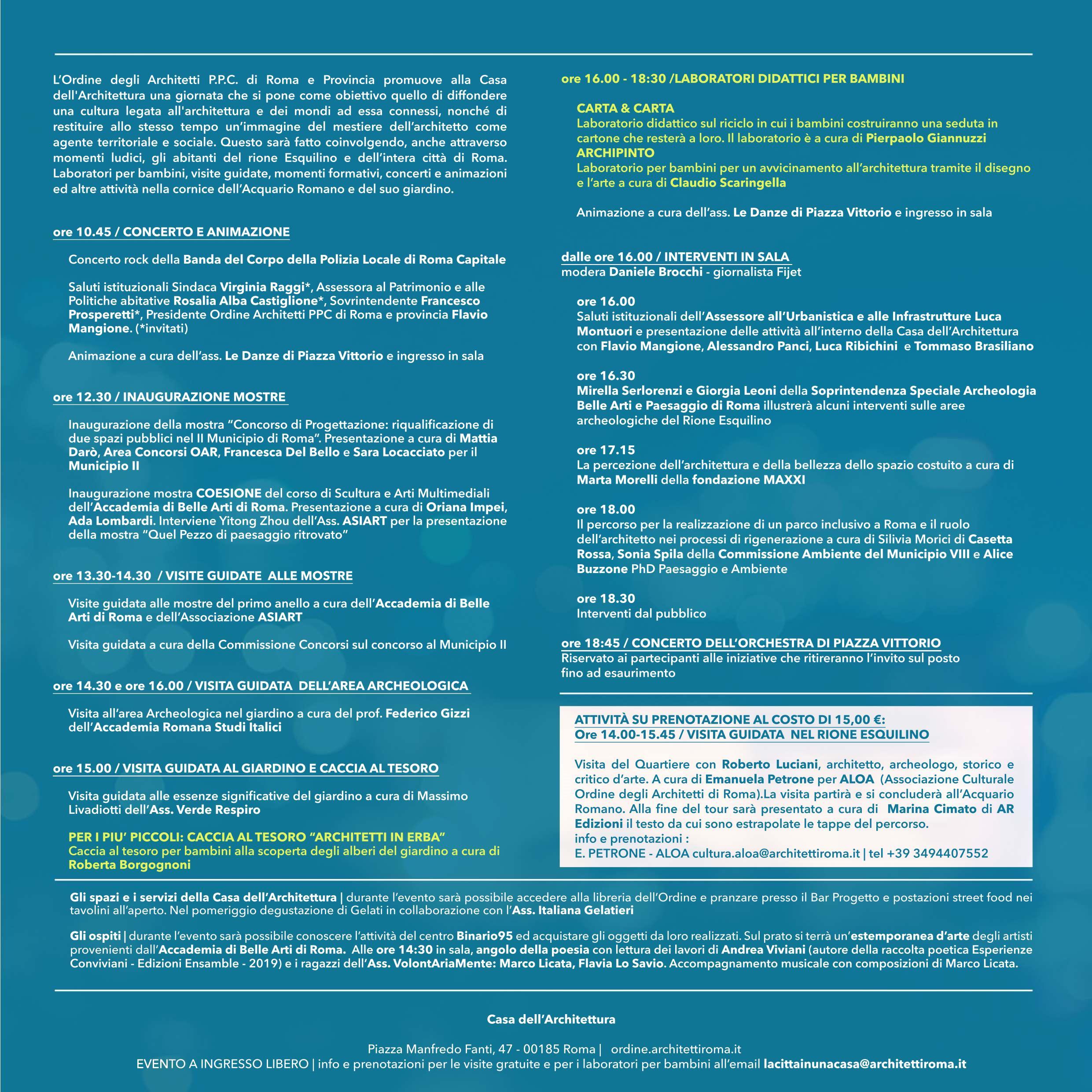 Si ricorda che durante la giornata vi saranno attività laboratoriali per bambini, attività e visite guidate aperte a tutti. Per le visite guidate e per i laboratori per i più piccoli si consiglia di prenotare come da riferimenti sul programma (per i bambini che parteciperanno ai laboratori pomeridiani la partecipazione al concerto non avrà necessità di prenotazione).