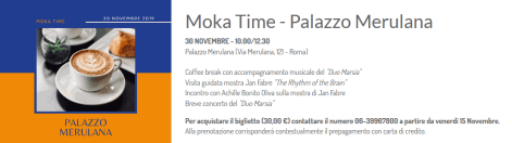 Dalle ore 10.00 alle ore 12.30 primo appuntamento con Moka time che prevede, oltre alla visita guidata alla mostra, una colazione offerta dalla Centrale del Latte di Roma e corner caffè a cura della buvette di Palazzo Merulana.