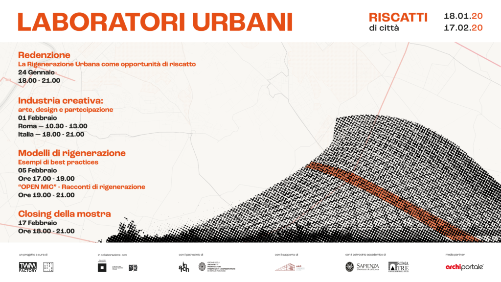 Il progetto-mostra Riscatti di Città propone un ricco palinsesto di incontri volto ad investigare e co-progettare la riabilitazione della città, a partire dai suoi protagonisti per stimolare la partecipazione sulla più grande riflessione sulla rigenerazione urbana mai fatta a Roma.