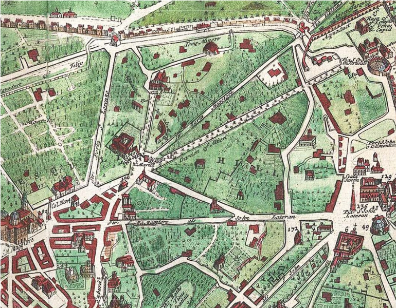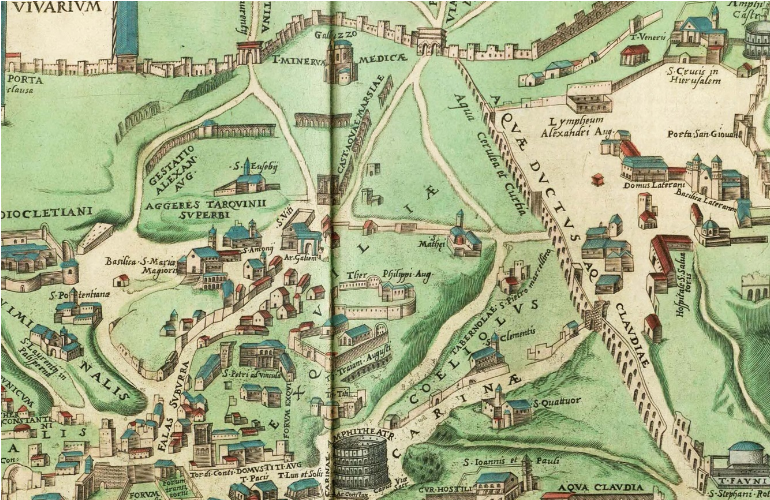 Un particolare dell’Esquilino nella mappa di Roma di George Braun del 1612. Oltre ad una impronta decisamente artistica sono facilmente riconoscibili tutti i monumenti dell’Esquilino dell’epoca. Due menzioni per l’Anfiteatro Castrense e il cd. Tempio di Minerva Medica che appaiono in condizioni decisamente migliori di quanto non siano oggi