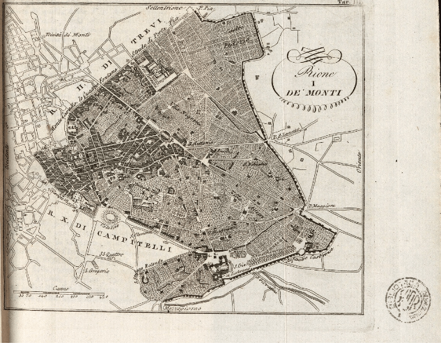 Questa invece è una mappa del Rione Monti del 1826. Come è facile vedere, all’epoca i Rioni Monti ed Esquilino erano uniti tra di loro  dato che, ufficialmente e formalmente, solo con la delibera comunale del 20 agosto 1921  l’Esquilino divenne il Rione XV con gli attuali confini.