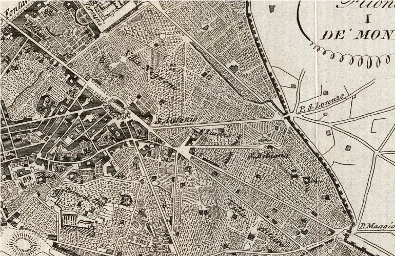 Nell’immagine accanto un particolare dell’Esquilino: oltre ai monumenti, perfettamente riconoscibili Villa Negroni (odierna Stazione Termini) e Villa Altieri (viale Manzoni)