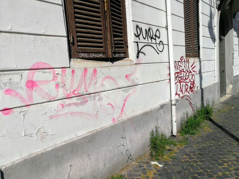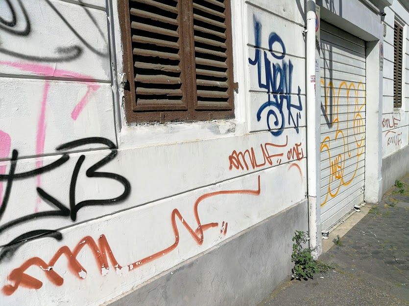 Ed ecco come hanno ripreso ad imbrattare i muri. In qualche caso è possibile vedere la lotta infinita tra i vandali e i proprietari degli immobili e/o il Comune: strati su strati tra graffiti e riverniciature. Da notare la ripresa degli imbrattamenti sul muro perimetrale di Santa Bibiana