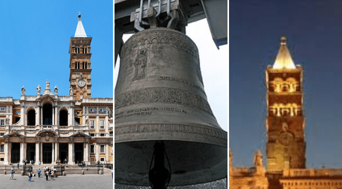Il campanile romanico di S. Maria Maggiore è alto 75 metri, il più alto di Roma. Costruito tra il 1375-1376, è stato, nei secoli, rialzato e completato sotto il cardinale Guglielmo d’Estouteville, arciprete della basilica fra il 1445 e il 1483, a cui si deve anche, per fini statici, la grossa volta a crociera di divisione tra la parte inferiore e il primo piano. Nei primi anni dell’Ottocento fu munito di un orologio. Una delle campane è detta “La Sperduta” e suona appena dopo le 21. In merito ad una leggenda che risale al XVI secolo: quella della pastorella (pare cieca) che si era persa nei prati intorno all’Esquilino, pascolando il suo gregge; era ormai sera e la pastorella non tornava, furono fatte suonare le campane della Basilica di Santa Maria Maggiore perché i rintocchi la guidassero a casa. Sembra poi che effettivamente lei non tornò mai più ma le campane continuino a chiamarla. Da qui il rito serale detto appunto della “Sperduta”. Altra storia simile, ambientata nello stesso periodo, narra che, invece di una pastorella, si fosse sperduta una pellegrina (o un distinto viaggiatore, secondo altre fonti) che, venendo a Roma a piedi, avesse appunto perso la strada e pertanto si fosse raccomandata alla Vergine per essere aiutata. Subito udì i rintocchi della campana, seguendo i quali raggiunse la Basilica di Santa Maria Maggiore e quindi la salvezza. In ricordo del fatto la pellegrina lasciò una rendita affinché alle 2 di notte (trasformate alle 9 di sera nei tempi recenti) venisse perpetuamente suonata la campane.