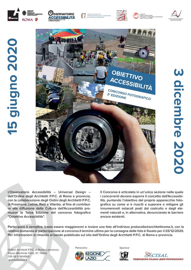 C’è ancora tempo, fino al prossimo 3 dicembre, per partecipare alla terza edizione di Obiettivo Accessibilità, il concorso fotografico promosso dall’Osservatorio Accessibilità – Universal Design – dell’Ordine degli Architetti di Roma e provincia – con la collaborazione degli Ordini di Frosinone, Latina, Rieti e Viterbo – con l’obiettivo di contribuire alla diffusione della «cultura dell’accessibilità».
