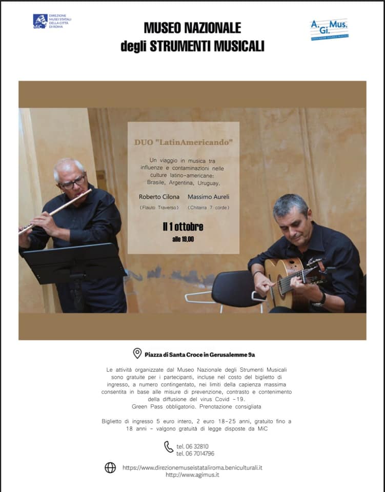 Il Museo Nazionale degli Strumenti Musicali, festeggia la Giornata Internazionale della Musica con un viaggio sonoro tra influenze e contaminazioni nelle culture latino americane. Alle 19.00 si terrà un concerto a cura di Roberto Cilona al flauto traverso e Massimo Aureli che si cimenterà alla chitarra settecorde. La Giornata Internazionale della Musica è stata istituita nel 1975 dall’International Music Council con la motivazione di “celebrare in tutto il mondo l’importanza della musica e dei musicisti e di promuoverne il valore nella società, dato che la musica contribuisce alla pace e alla comprensione con un linguaggio universale”. In occasione del concerto sarà aperta al pubblico la sezione del museo in fase di allestimento dove sono conservati gli strumenti musicali “dal Mondo”, strumenti etnici e popolari, esempi di una tradizione che si tramanda da centinaia di anni, di padre in figlio.