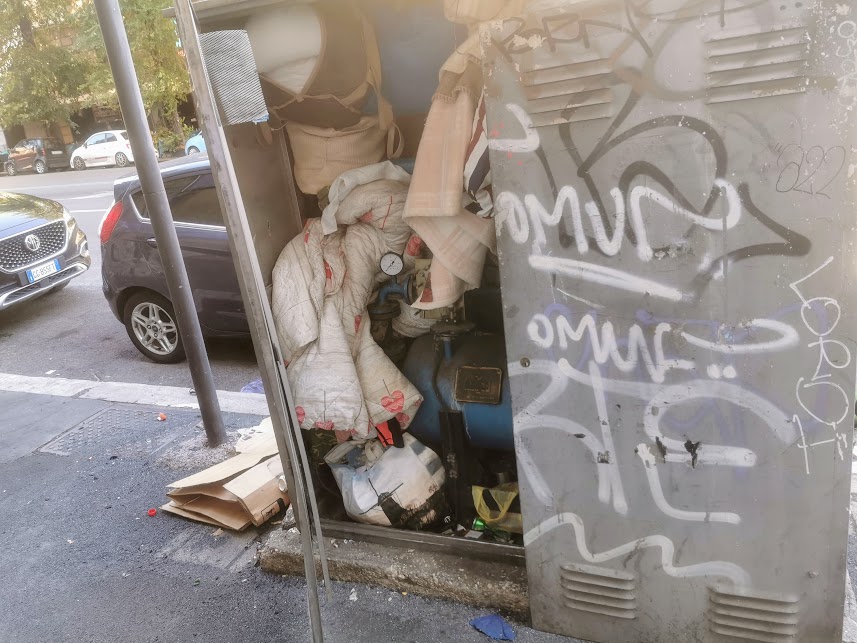 Gli armadi sui marciapiedi dei vari servizi (gas, acqua, elettricità, telefono etc.) sono sparsi per tutta Roma e dovrebbero essere protetti sia per ragioni di sicurezza sia per evitare eventuali disservizi. Purtroppo all’Esquilino non è così e alcuni di questi armadi sono diventati i contenitori per gli homeless, i rovistatori, i pulivetro e gli ubriaconi di turno che spesso li riempiono di bottiglie vuote.