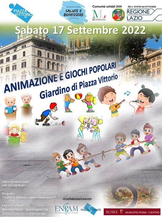 Si svolgerà Sabato 17 settembre 2022 all’interno dei giardini “Nicola Calipari” di Piazza Vittorio, la manifestazione denominata “Animazione e Giochi Popolari” e riservata agli alunni delle scuole per riscoprire il piacere dei giochi di gruppo.L’evento, organizzato da Massimo Renzi, fa parte del progetto “IN PIAZZA VITTORIO SALUTE E BENESSERE”, ideato e promosso dall’associazione “Piazza Vittorio Aps” e finanziato dalla Regione Lazio nell’ambito del bando #comunitàsolidali 2020.La manifestazione è inoltre realizzata in collaborazione con la Fondazione Enpam, nell’ambito dell’iniziativa “Piazza della Salute” e con il Municipio Roma I Centro.