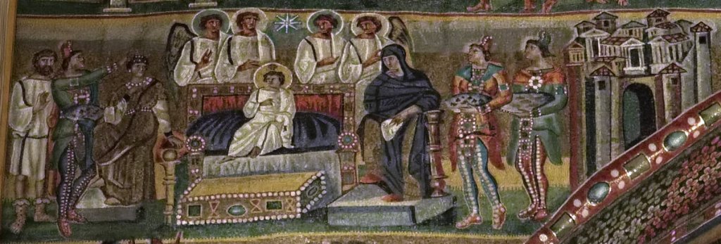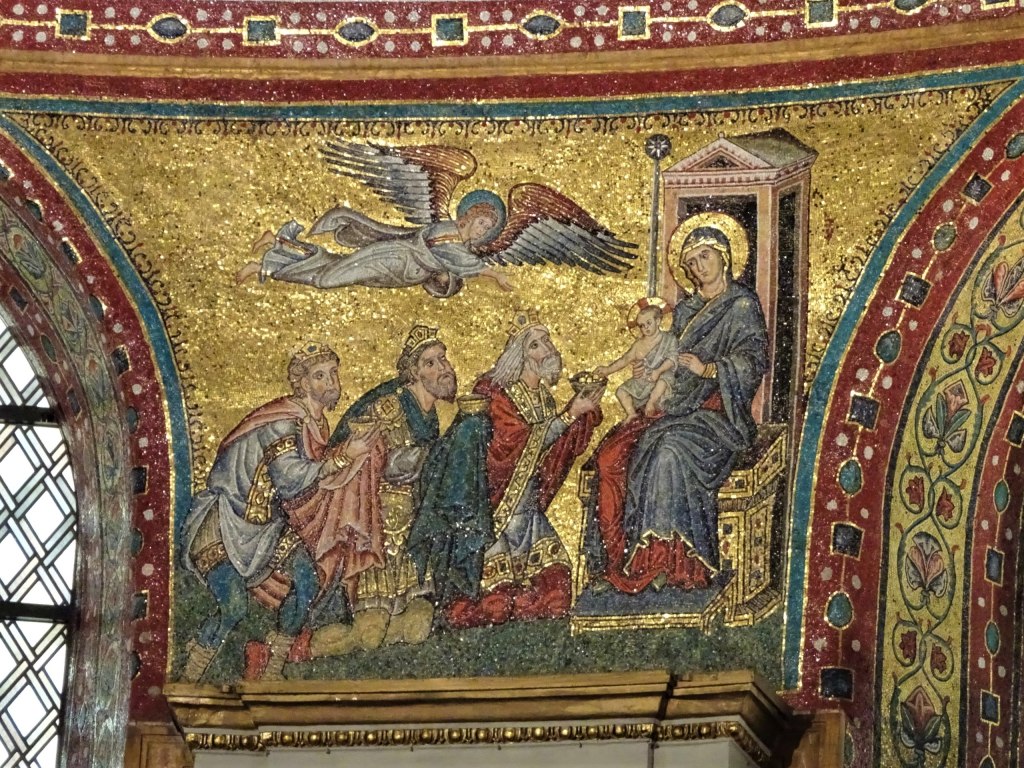 Il primo è una delle scene che compongono il ciclo musivo dedicato all’infanzia di Gesù nell’Arco Trionfale. E’ antichissimo (V secolo d.C.) e la scena è rappresentata in maniera assai diversa da come la immaginiamo da secoli e da come ci è stata tramandata dall’epoca di San Francesco. Gesù Bambino appare come un re o un imperatore assiso su un trono e la Vergine Maria come la Regina Madre. I Magi si presentano con vestiti di foggia orientale (persiana?) e sembrano tutti di giovane età a differenza dell’iconografia tradizionale che da secoli li indica come persone di età diversa e con vestiti tipicamente occidentali. Presumibilmente anche i doni sembrano diversi da quelli universalmenti conosciuti come l’oro, l’incenso e la mirra.