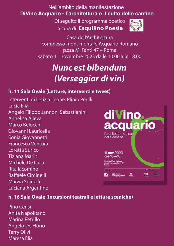 DiVino Acquario, giornata di degustazioni in collaborazione con il Consorzio di Tutela Atina Cabernet Dop e con AIS Lazio – Associazione Italiana Sommelier.L’evento prevede una giornata di degustazione a banco d’assaggio dei vini del territorio, sotto la guida dei sommelier di Ais Lazio, che saranno presenti ai banchi insieme ai produttori. Oltre alle degustazioni ci saranno: proiezione sugli schermi di fotografie di cantine d’autore, declamazione di versi a cura di Esquilino Poesia (“verseggiar di vino”), acquerelli a base di vino (“vinarelli”), laboratorio per bambini (“in vino veritas”).
