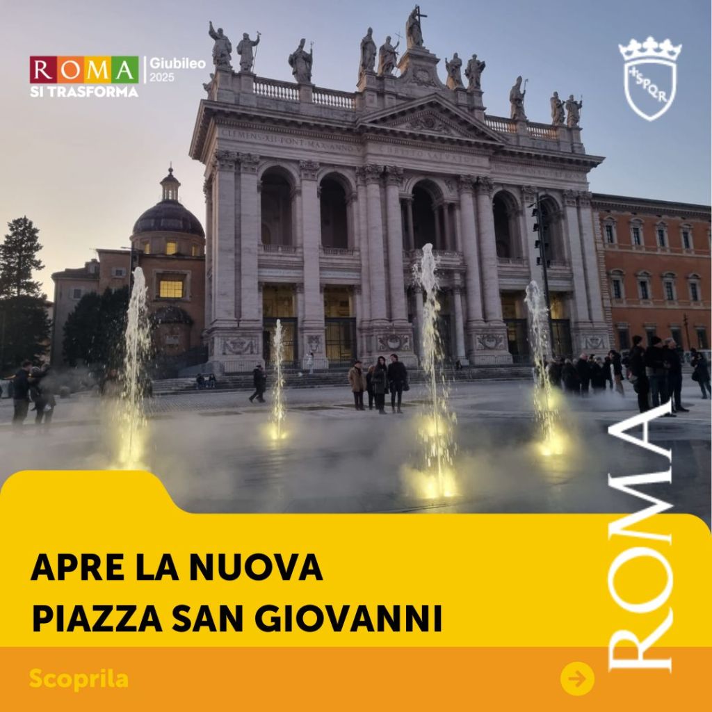 Grandi cerchi, fontane a raso, il prato che si alterna a sanpietrini e lastricato in pietra. È la nuova piazza San Giovanni, riqualificata per il Giubileo ed inaugurata oggi dal sindaco, Roberto Gualtieri, insieme con monsignor Fisichella, il cardinale vicario Baldassarre Reina, l’assessora capitolina ai Lavori Pubblici, Ornella Segnalini, e la soprintendente speciale di Roma, Daniela Porro.