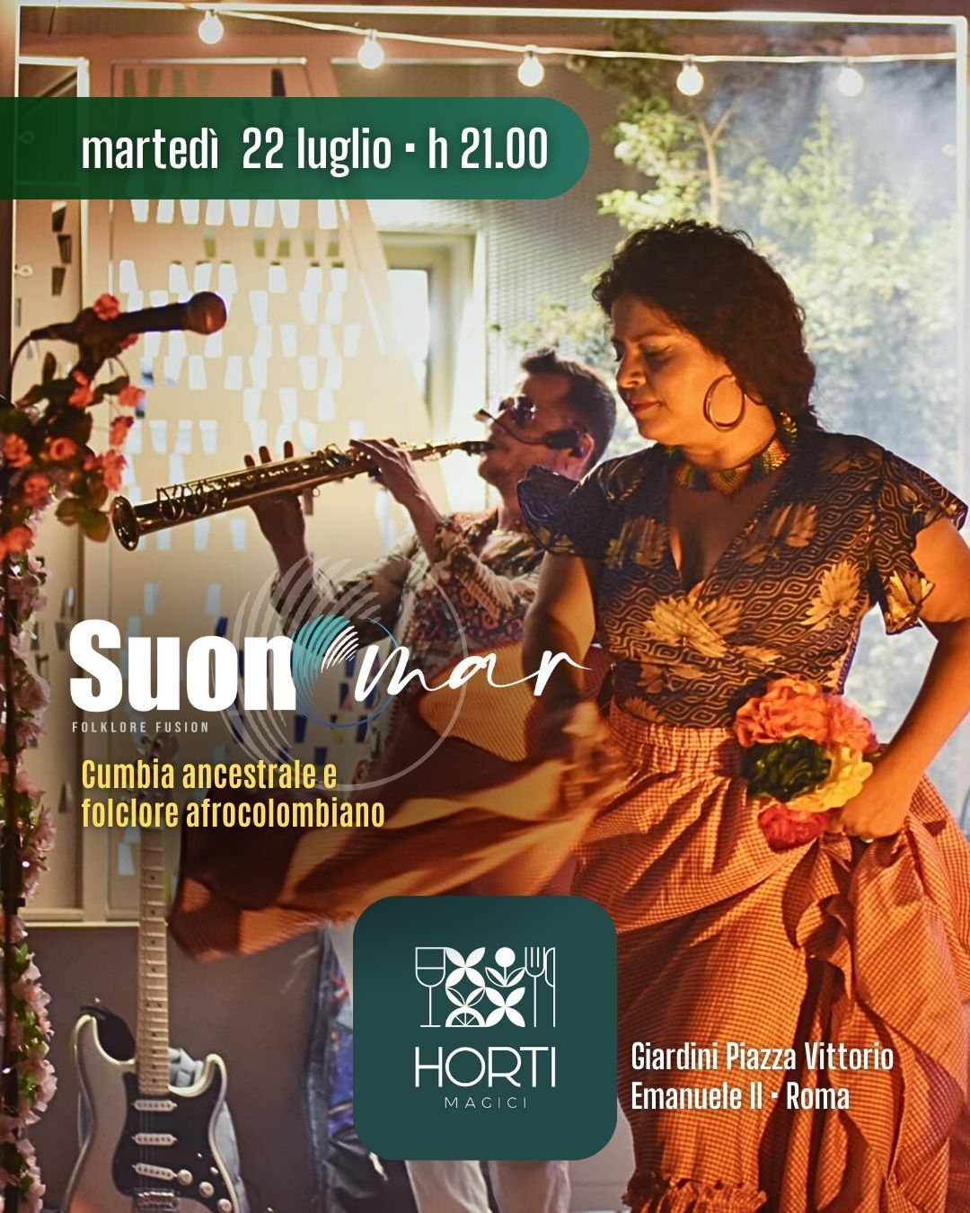 Suonomar è un viaggio che vi condurrà nella loro terra ancestrale attraverso i suoi tanti generi musicali come Bullerengue, Chalupa, Porro, Fandango, Puya, Mapalè, fino ad arrivare alla più celebre, la Cumbia, che vide i suoi albori proprio nella costa nordcolombiana, estesasi poi a macchia d’olio nell’intero continente ispano-americano fino a diventare ad oggi un vero e proprio movimento culturale.