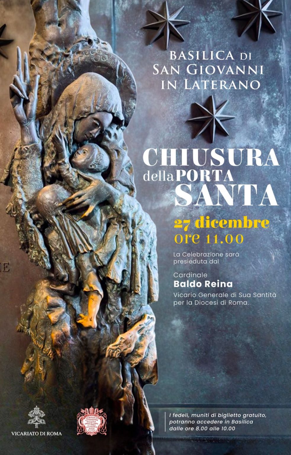 Il rito di chiusura della Porta Santa della basilica di San Giovanni in Laterano avrà luogo sabato 27 dicembre alle ore 11 e sarà presieduto dal cardinale Baldo Reina, vicario generale di Sua Santità per la diocesi di Roma; seguirà la celebrazione eucaristica, che sarà animata dal Coro della Diocesi di Roma diretto da monsignor Marco Frisina. Il rito sarà trasmesso in diretta sul canale YouTube della diocesi di Roma.