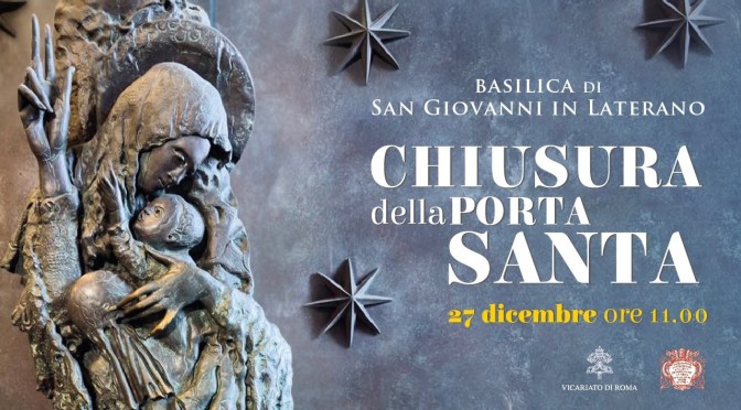 Il rito di chiusura della Porta Santa della basilica di San Giovanni in Laterano avrà luogo sabato 27 dicembre alle ore 11 e sarà presieduto dal cardinale Baldo Reina, vicario generale di Sua Santità per la diocesi di Roma; seguirà la celebrazione eucaristica, che sarà animata dal Coro della Diocesi di Roma diretto da monsignor Marco Frisina. Il rito sarà trasmesso in diretta sul canale YouTube della diocesi di Roma.