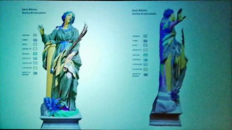 Guardando la statua di Santa Bibiana prima che venisse retaurata si può notare quello che spinse, dopo un attento esame del gruppo di restauratori guidato dalla prof.ssa M. Grazia Chilosi, a spostarla per analizzarla accuratamente ed operare un restauro che le ridonasse la posizione originale che risultava evidentemente alterata da quella che G.L.Bernini aveva pensato nel 1625. Mai e poi mai un genio perfezionista come lui avrebbe accettato che la colonna del martirio non fosse perpendicolare alla base e che la statua fosse visibilmente spostata sulla sinistra e non al centro del basamento come evidenziato nella figura 1