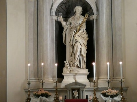 Ebbene il Bernini escogitò un abile stratagemma perchè la luce dell’alba illuminasse il viso della santa: ideò un finestrone (nella figura 10 in alto a sinistra) che attraverso un complesso e geniale sistema di squinci riuscisse a far passare la luce e ottenesse l’effetto scenografico di Santa Bibiana in estasi mentre guarda Dio Onnipotente (al centro della volta nella figura 10).