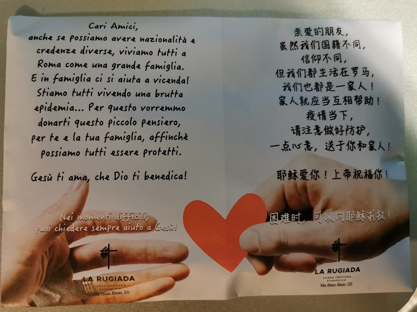 Onestamente era difficile trovare le parole adatte per augurare Buona Pasqua in un momento come quello che stiamo vivendo a causa del coronavirus. Ma poi uno squillo del citofono, una voce che con cadenza orientaleggiante diceva che aveva un piccolo regalo per tutti gli abitanti del condominio: una busta con delle mascherine dono di una comunità religiosa cinese che da un pò di tempo è a via Bixio. Ebbene questo gesto ci ha commosso e condividiamo pienamente lo spirito che lo ha promosso: aiutiamoci a vicenda perchè solo così potremo uscire da questo buio tunnel.