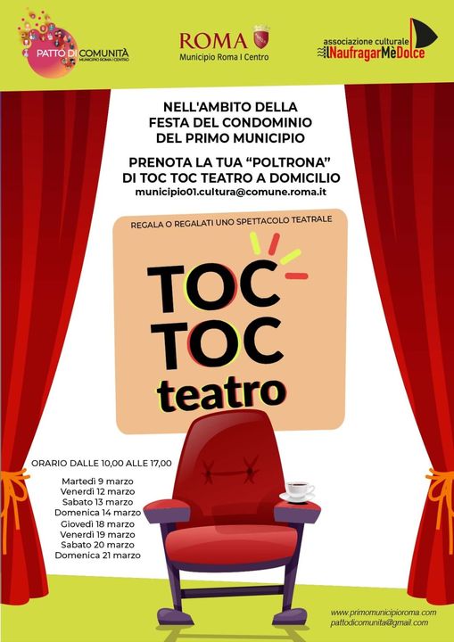 Per ora desideriamo comunque che il 9 marzo sia una giornata importante per il nostro territorio, in cui consolidare la solidarietà e la relazione tra vicini, e per questo porteremo un po’ di allegria e svago nei vostri cortili, pianerottoli, ballatoi, terrazze con una iniziativa bella e colorata, ossia “TOC TOC – il teatro a domicilio”. Brevi rappresentazioni teatrali a cura della compagnia “Naufragar m’è dolce” da tenersi nei cortili dei condomini, sui ballatoi, nei pianerottoli, sempre rispettando le norme di distanziamento e sicurezza.