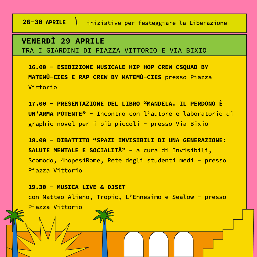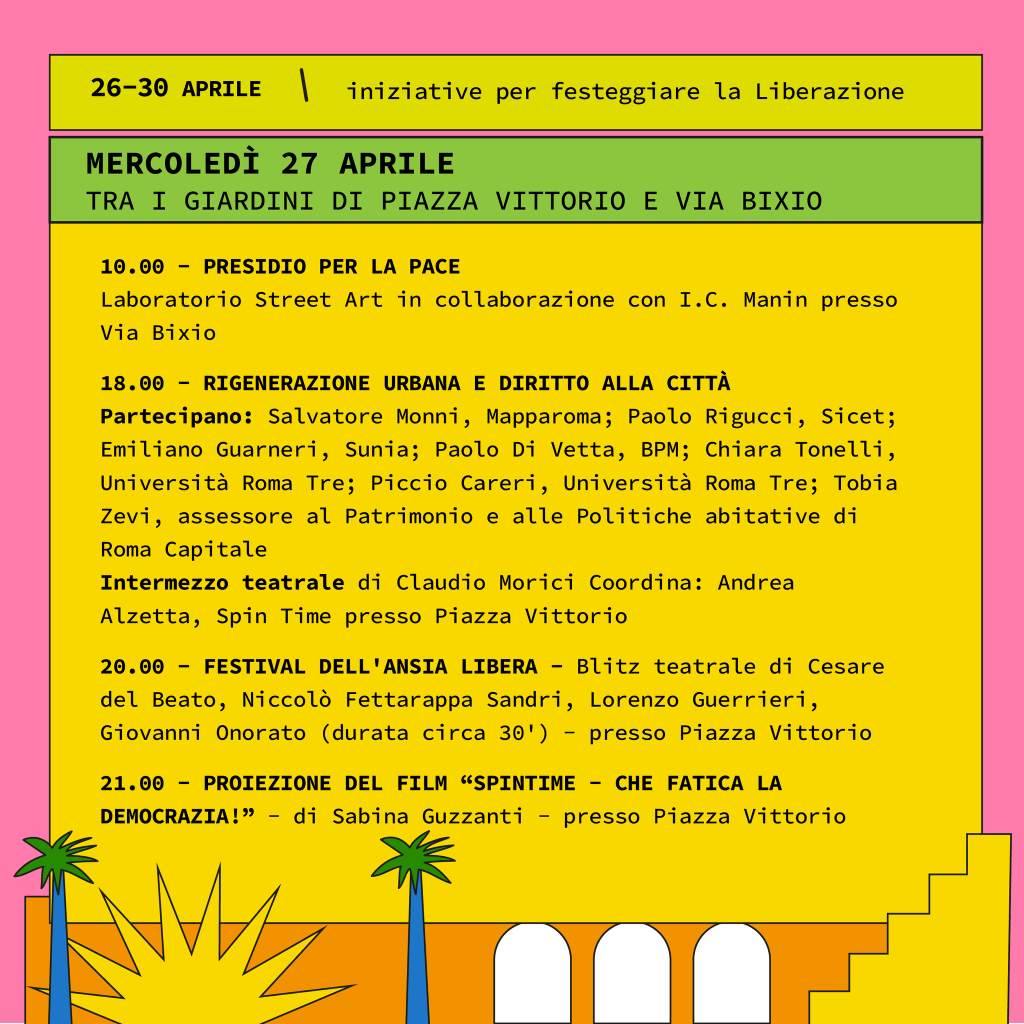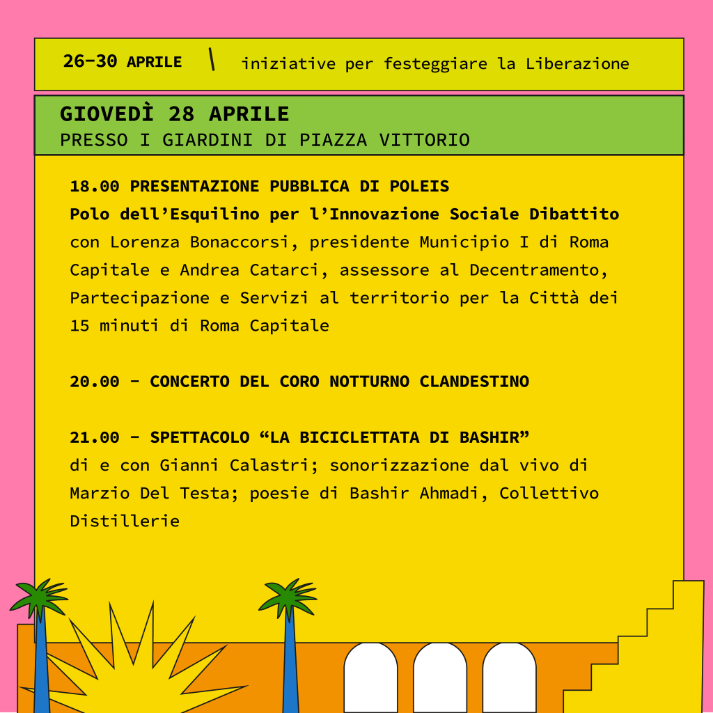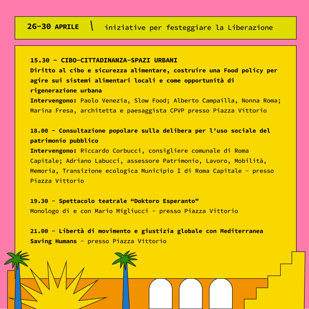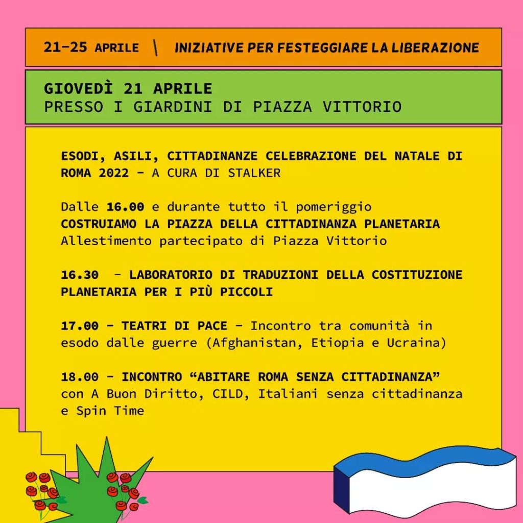Nel periodo tra il Natale di Roma ed il Primo Maggio, passando per il 25 Aprile, vogliamo trasformare l’Esquilino in una grande Agorà, una piazza aperta alle storie, alle battaglie e alle idee delle tante comunità che attraversano il rione.