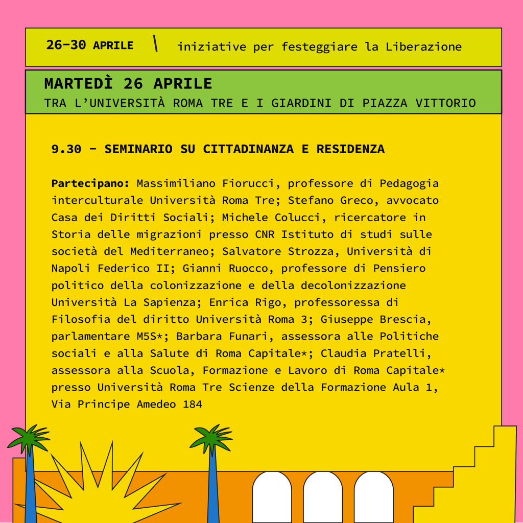 9.30 Seminario su cittadinanza e residenza Partecipano: Massimiliano Fiorucci, professore di Pedagogia interculturale Università Roma Tre; Stefano Greco, avvocato Casa dei Diritti Sociali; Michele Colucci, ricercatore in Storia delle migrazioni presso CNR – Istituto di studi sulle società del Mediterraneo; Salvatore Strozza, Università di Napoli Federico II; Gianni Ruocco, professore di Pensiero politico della colonizzazione e decolonizzazione Università La Sapienza, Enrica Rigo profes.sa di Filosofia del diritto Università Roma Tre, Giuseppe Brescia, parlamentare M5S*; Barbara Funari, assessora alle Politiche sociali e alla Salute di Roma Capitale*; Claudia Pratelli, assessora alla Scuola, Formazione e Lavoro di Roma Capitale* *sono invitati a partrecipare presso Università Roma Tre Scienze della Formazione Aula 1, Via Principe Amedeo 184