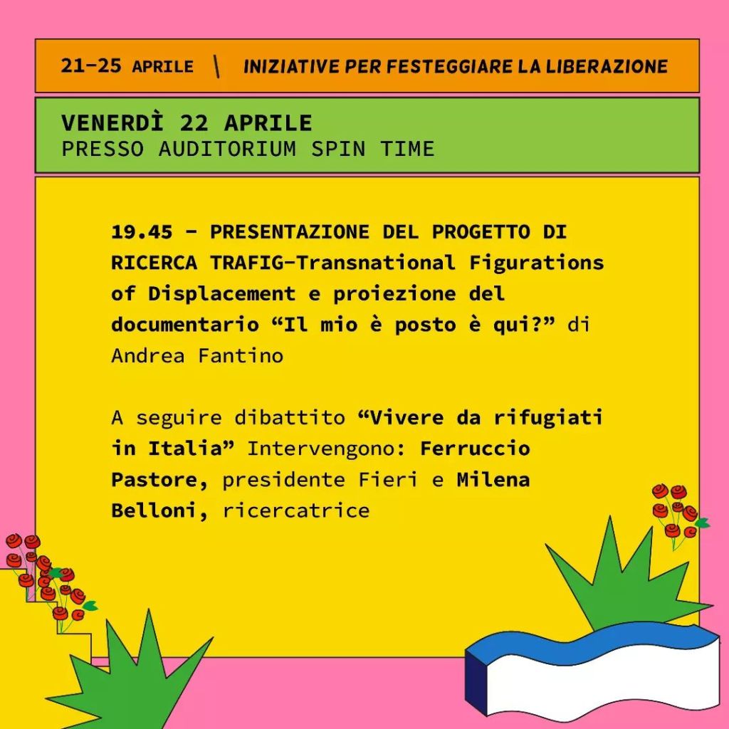 19.45 Presentazione del progetto di ricerca TRAFIG – Transnational Figurations of Displacement e proiezione del documentario “Il mio è posto è qui?” di Andrea Fantino a seguire dibattito “Vivere da rifugiati in Italia” Intervengono: Ferruccio Pastore, presidente Fieri, e Milena Belloni, ricercatrice