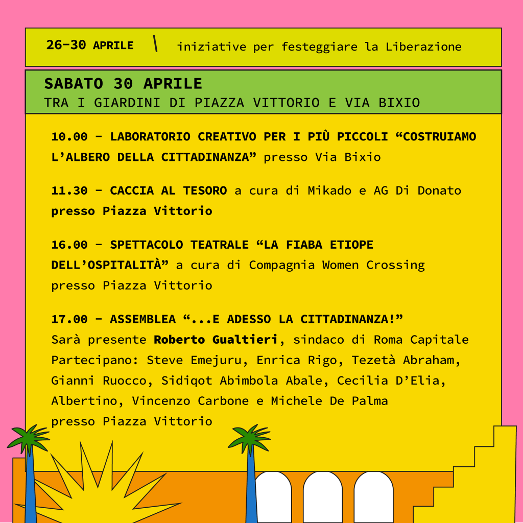 17.00 Assemblea “…e adesso la Cittadinanza!” All’assemblea sarà presente Roberto Gualtieri, sindaco di Roma Capitale Partecipano: Steve Emejuru, Enrica Rigo, Tezetà Abraham, Gianni Ruocco, Sidiqot Abimbola Abale, Cecilia D’Elia, Albertino, Vincenzo Carbone e Michele De Palma
