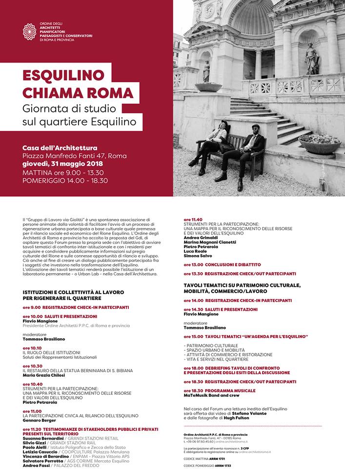 Lo scorso 31 maggio è stato organizzato presso la Casa dell’Architettura a Piazza Manfredo Fanti l’evento “Esquilino chiama Roma. Giornata di studio sul quartiere Esquilino” organizzato dal “Gruppo di Lavoro via Giolitti”. E’ stata l’ennesima occasione per un confronto tra cittadini, associazioni, mondo accademico, aziende e istituzioni (a livello di I Municipio) sul tema della riqualificazione del Rione Esquilino.