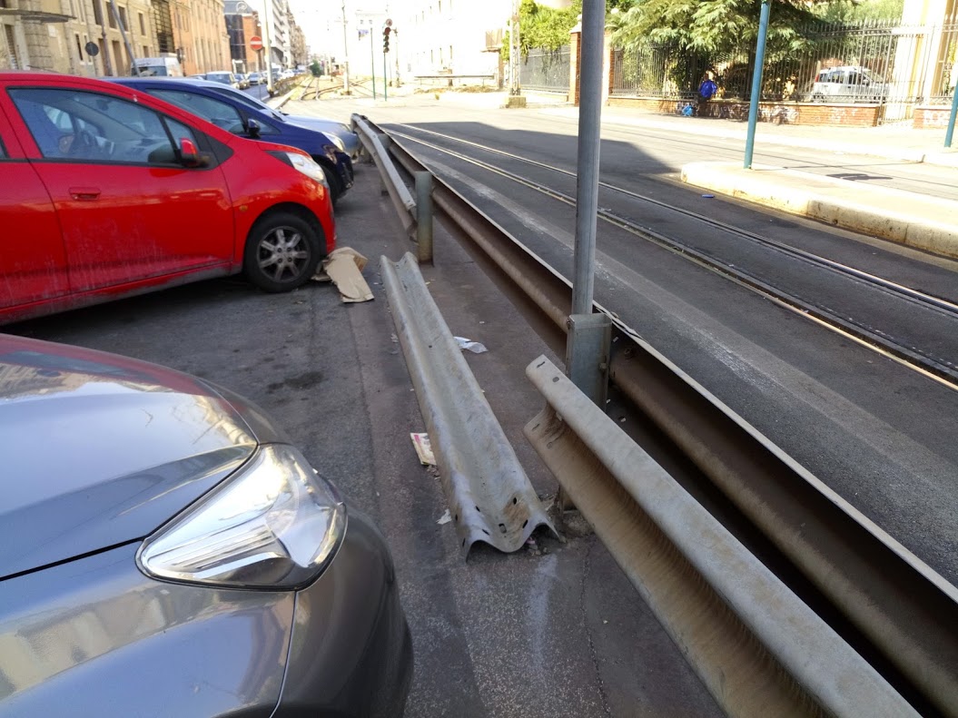 Non solo, tralasciando le vibrazioni e i rumori, chi abita a via Giolitti e ha bisogno di trasportare oggetti volumunosi e pesanti (traslochi, materiali edili vari etc.) deve per forza di cose utilizzare il marciapiede, ostacolando così ulteriormente il transito dei pedoni, che si vedono costretti a passare sulle rotaie, perchè non esiste alternativa.