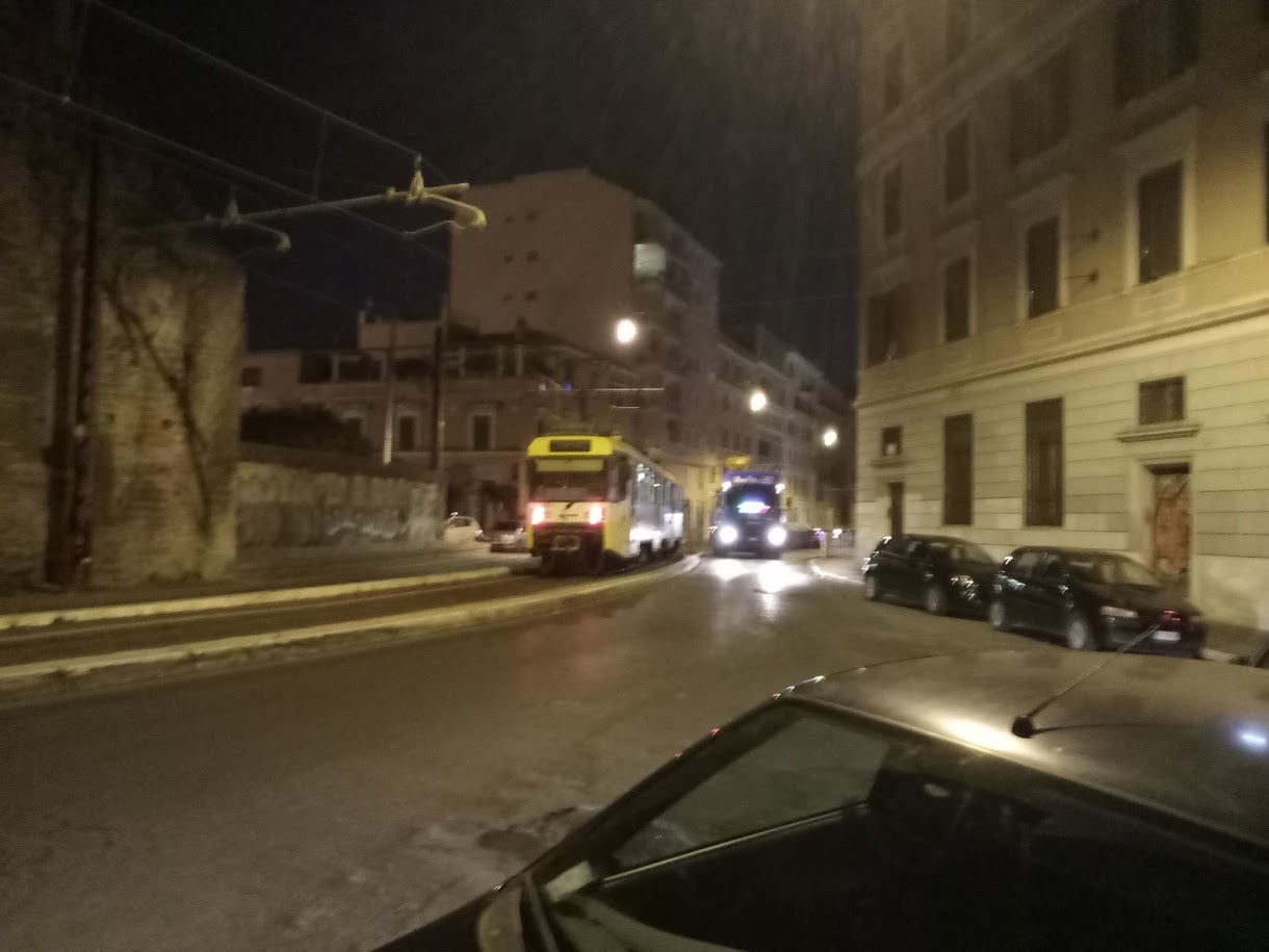 Ma non basta, la sede stradale è talmente stretta che quando un veicolo di soccorso o di servizio ha necessità di fermarsi per poter espletare il proprio lavoro non ha scelta, o invade la sede rotabile o la strada. Nella foto del 4 settembre 2017 un mezzo impegnato nella riparazione della conduttura d’acqua che si era rotta nei mesi scorsi a via Giolitti ostacola il passaggio del treno Laziali Centocelle senza avere colpe ma solo per motivi di spazio dal momento che il problema era sulla sede stradale.
