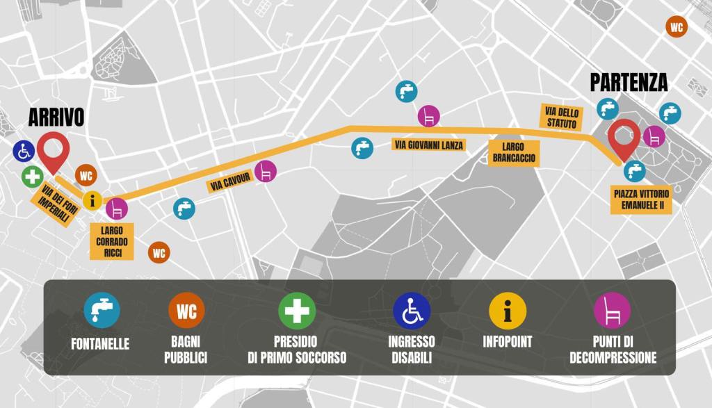 Il corteo sfilerà, dalle 14 e sino alle 20, da piazza della Repubblica con destinazione viale delle Terme di Caracalla e percorso su viale Luigi Einaudi, piazza dei Cinquecento, via Cavour, largo Corrado Ricci, via dei Fori Imperiali, piazza del Colosseo, via Celio Vibenna, via di San Gregorio, piazza di Porta Capena.
