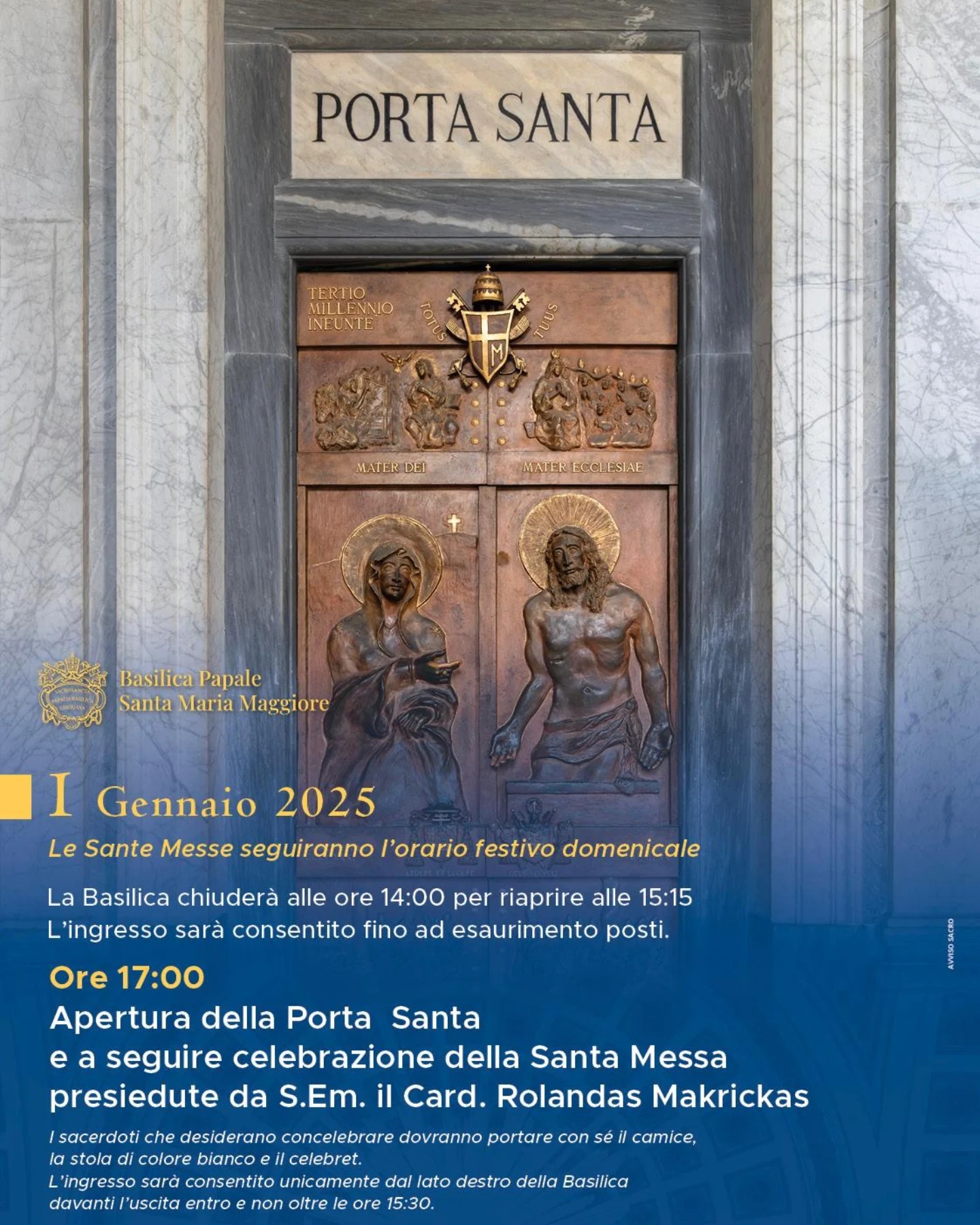Il cardinale vicario Baldassare Reina domenica 29 dicembre, Festa della Santa Famiglia di Gesรน, Maria e Giuseppe, alle ore 10, celebrerร la Messa nella basilica lateranense, subito dopo aver aperto la Porta Santa. Per i sacerdoti che desiderano concelebrare sono a disposizione dei biglietti presso lโUfficio Liturgico (al secondo piano del Palazzo Lateranense) che possono essere ritirati entro venerdรฌ 20 dicembre (mercoledรฌ 18 dalle 14.30 alle 17; giovedรฌ 19 e venerdรฌ 20 dalle 8.30 alle 13). I fedeli che vorranno partecipare alla celebrazione del 29 dicembre non necessitano di biglietto.