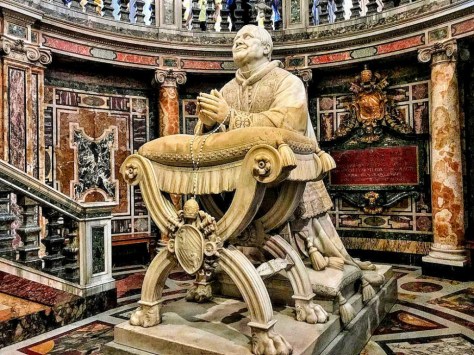 Nel cuore della Basilica papale di Santa Maria Maggiore, a Roma, c’è una grande scultura che raffigura un pontefice raffigurato in ginocchio mentre, con il rosario appeso alle mani giunte, adora la Reliquia della Mangiatoia in cui Gesù venne alla luce.